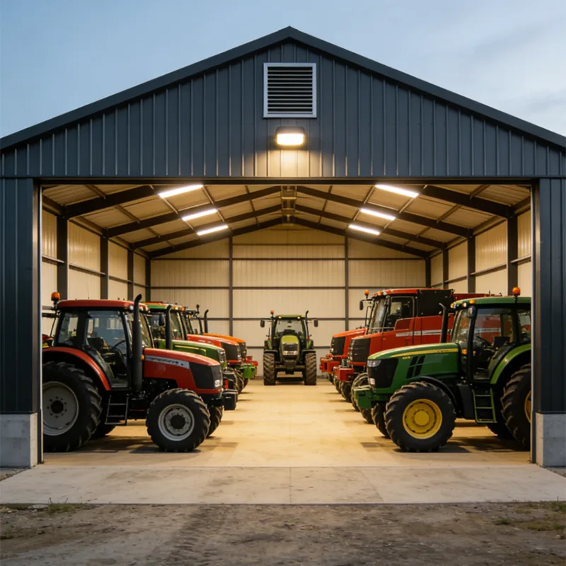 Die moderne Landwirtschaft erfordert riesige Maschinen, und bei traditionellen Gebäuden mangelt es oft an ausreichender Bodenfreiheit. Unsere Stahllagerschuppen für landwirtschaftliche Maschinen nutzen die fortschrittliche „Clear Span“-Technologie und bieten freie Innenbreiten von bis zu 60 Metern ohne Innensäulen. Dies bietet maximale Manövrierflexibilität für übergroße Erntemaschinen und mehrreihige Sämaschinen. Wir bieten anpassbare Traufhöhen (bis zu 12–15 Meter) und extra breite Schiebe- oder Industrie-Rolltore, um sicherzustellen, dass selbst Ihre größten Druckluftwagen und Sprühgeräte problemlos ein- und aussteigen können, wodurch das Risiko versehentlicher struktureller Stöße verringert wird.