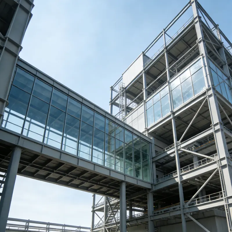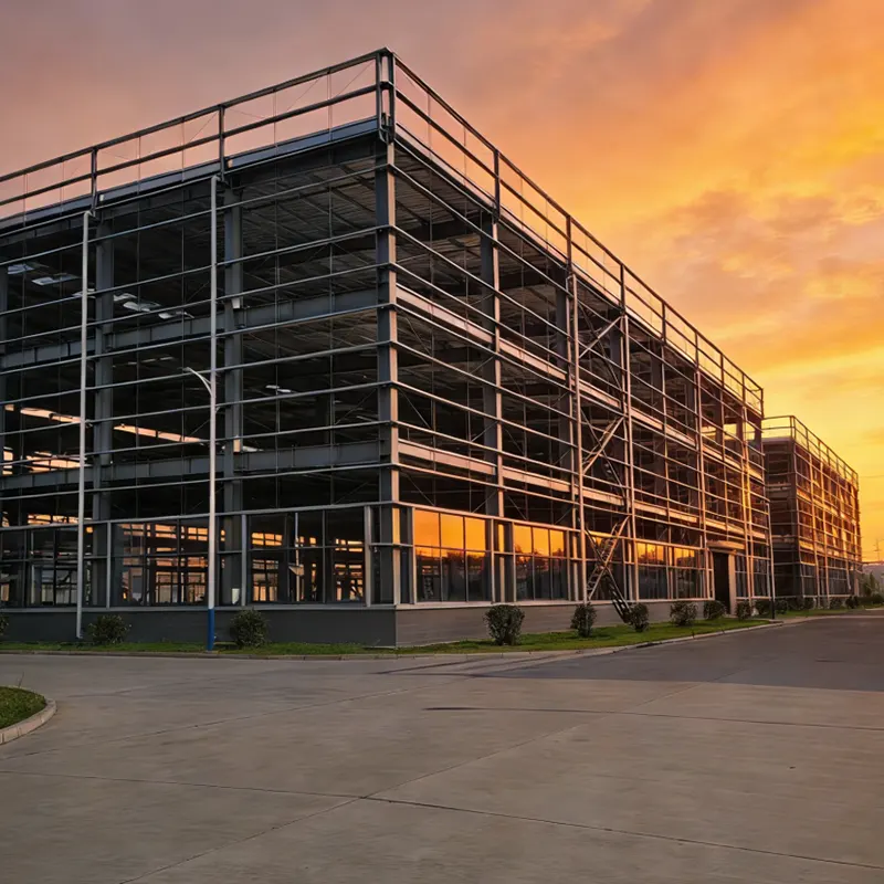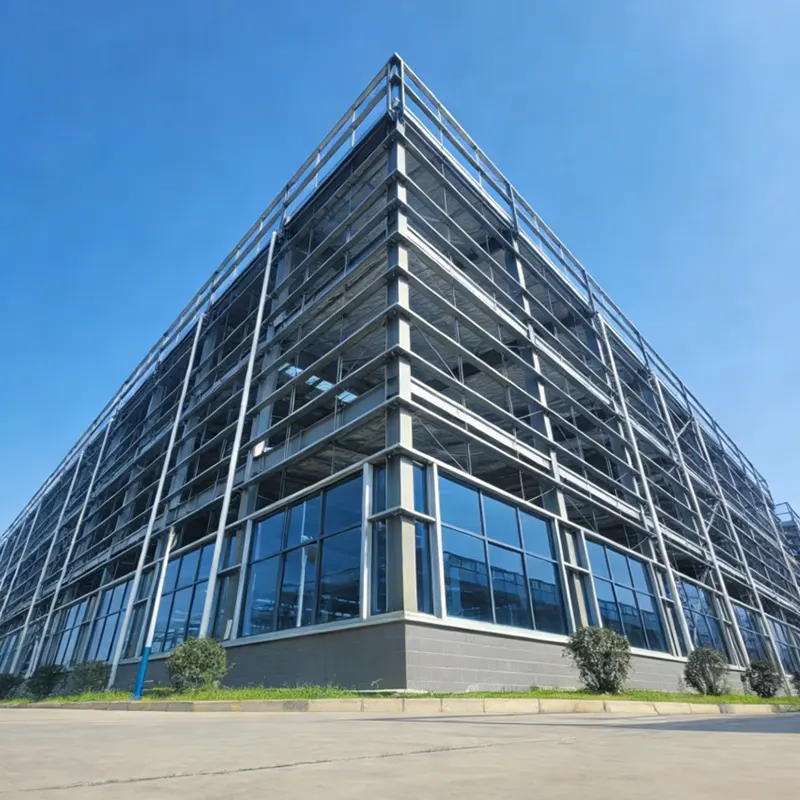Mehrstöckiger Fabrikblock mit Stahlkonstruktion, hergestellt aus hochwertigen Stahlprofilen für stabile Tragfähigkeit, Erdbeben- und Windbeständigkeit. Die werkseitige Vorfertigung ermöglicht hohe Präzision, schnelle Montage vor Ort und eine anpassbare Raumaufteilung und passt sich mit flexiblen Säulenabständen und freier Höhengestaltung an unterschiedliche Produktions- und Lageranforderungen an.