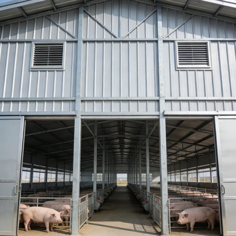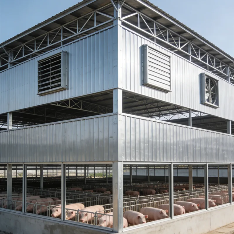 Unser Schweinefarmgebäude mit Stahlkonstruktion ist eine professionelle, leistungsstarke Lösung, die auf die moderne Intensivschweinezucht zugeschnitten ist. Durch die Kombination fortschrittlicher Stahlbautechnologie mit tierhaltungsspezifischem Design bietet es außergewöhnliche Haltbarkeit, strukturelle Stabilität und Anpassungsfähigkeit an Schweinezuchtszenarien. Der leichte und dennoch robuste Stahlrahmen ermöglicht eine flexible Raumaufteilung, eine effiziente Belüftung und eine einfache Integration von Zuchtgeräten (Fütterungssysteme, Mistaufbereitungsanlagen, Temperaturkontrollgeräte). Mit korrosionsbeständigen, antibakteriellen und leicht zu reinigenden Eigenschaften erfüllt es effektiv die Anforderungen zur Seuchenprävention und sorgt gleichzeitig für ein angenehmes Lebensumfeld für Schweine. Ganz gleich, ob Sie einen Bauernhof im Standardmaßstab oder eine maßgeschneiderte Großzuchtbasis benötigen, wir liefern zuverlässige Produkte, die den internationalen Standards und den Normen der Tierhaltungsindustrie entsprechen.